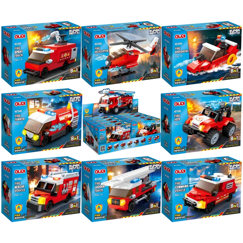 - Description:40104A-Fire Rescue Vehicle -87PCS; 40104B-Fire Ladder Truck -81PCS; 40104C-Fire Communication Vecle -86PCS; 40104D-Fire Tanker Truck-84PCS; 40104E-Fire Jeep-94PCS; 40104F-Fire Spray Truck-83PCS; 40104G-Fire Helicopter-76PCS; 40104H-Fire Speedboat-77PCS